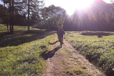 Scenderemo e risaliremo comode in un facile saliscendi su mulattiere e strade dedicate alle biciclette (elettriche ovviamente), una fermata in malga per degustare prelibatezze di salumi e formaggi e il ritorno a valle ad Alleghe.